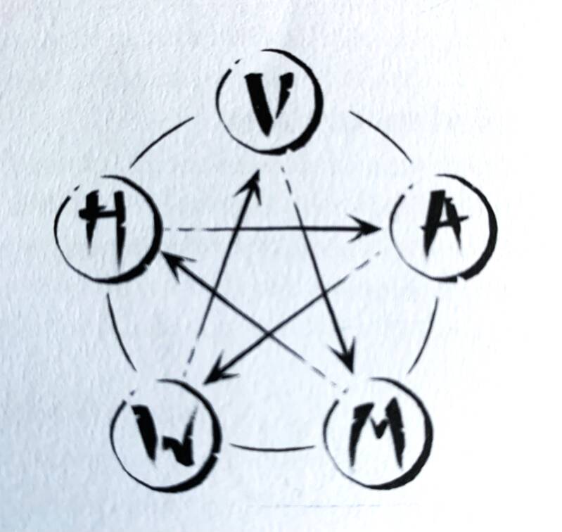 In een voedende of creatieve cyclus (buitenste cirkel HVAMW) spreek je van een gezonde situatie: er ontstaat een kettingreactie van voeding die begint in een element en een positief effect heeft op de andere elementen.